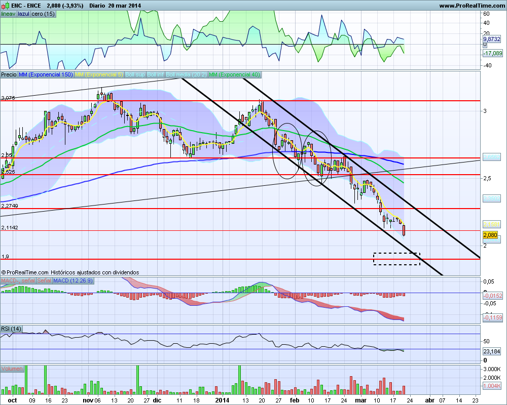 ENCE, seguimos cayendo, y a que ritmo,fijaros la vela de hoy, roto el soporte de 2.11 está el de 1.9, que ahí puede tener parada para rebote, pero por ahora, sin síntomas de fortaleza, solo pienso eso